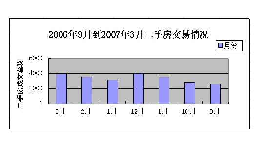 图2 2006.9-2007.3二手房交易情况 从(图2)可以看出,由于受元旦等因素的影响,2007年1月份的成交数量比06年12月份低一些,但年后三个月的成交总量比10月到12月的总量多(二月份由于受过年因素的影响,所以停止售房半个月,本图将二月份成交套数增加二倍,用来代表二月份总的售出数),而且从2006的数据也可以看出成交数量在逐月增加,所以推测,07年二手房的成交套数还将不断增加,并且总的售房数可以超过06年的售出总量。 四、结论 综上所述,成都二手房市场在未来的几年内还将不断发展,而且会主要集中在一到三环之间,因为期间可供开发的潜力较大,二手房的价格将继续升高,二手房在房产市场中的总的比重也将不断提高,以置业升级为目的的购房者总数会继续增加。但要认识到控制房价的因素有很多,比如国家政策、人民币币值、城市建设,所以购房者尤其是购买二手房的购房者应该认清形势,对形势进行充分分析后再做决定,以避免不必要的损失。 致谢: 感谢我的指导老师xx老师,她严谨细致、一丝不苟的作风一直是我工作、学习中的榜样;她循循善诱的教导和不拘一格的思路给予我无尽的启迪。在我遇到困难时,导师并没有放弃我,而是耐心细致的进行辅导,甚至是利用吃饭时间、午休时间给我修改论文。 感谢我的同学xxx、xxx、xx对我的帮助和指点。没有他们的帮助和支持,我肯定没有办法在规定的时间里完成毕业论文。 同时,也要感谢配合我调研的单位,毫无保留地为我的论文写作提供了参考资料,感谢部门主任的支持和对论文的提点,感谢同仁们在我无法胜任工作时主动帮我承担了工作任务。 在论文即将完成之际,我的心情无法平静,从开始进入课题到论文的顺利完成,我的师长、同学、领导、同事给了我巨大的帮助,在这里请接受我诚挚的谢意! 参考文献 [1].董大旻.上海二手房市场现状分析和发展建议.价格理论与实践[J],2006,(8):43-44 [2].宫萍.成都二手房市场回暖.城市开发[J],2006,(10):45-45 [3].成思敏.动态.房地产导刊[J],2006,(5期)::12-13 [4].斯翼.特区动态.住宅与房地产:综合版[J],2006,(8) :5-5 [5].姜鸿.二手房市场的发展趋势.集团经济研究[J],2006,(11):54-54. [6].毕博.二手房市场趋于理性. 投资北京[J],2006,(9):18-19 [7].谢亮书.略论二手房市场的良性发展问题.湖南大众传媒职业技术学院学报[J],2006,(4):105-106 [8].小乔.买二手房,把握好关键环节. 产权导刊[J],2006,(3):;39-39 [9].吴莹.二手房交易现状及购买参考.房地产导刊[J],2005,(11):86-87 [10].姜鸿.二手房市场的发展趋势.集团经济研究[J],2006,(11):54-54 [11].白青.二手房买卖要关注四大问题.中外房地产导报[J],2006,(12):54-55 [12].淇笙,李勇威.房价高额利润下的赌注.上海商业[J],2003,(11):15-16. [13].邓力.二手房市场形势与发展趋势.浙江房地产[J],2006,(4):21-22 <\/td>");