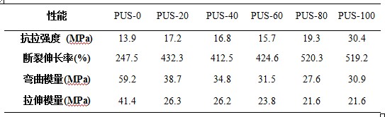 X1—羟值,mgKOH/g; V1—空白试验时氢氧化钾乙醇标准滴定溶液用量,mL; V2—滴定试样时氢氧化钾乙醇标准滴定溶液用量,mL; C—氢氧化钾乙醇标准滴定溶液浓度,mol/L; m—试样质量,g; X2—大二醇的酸值,mgKOH/g。 测定值取两次平行测定结果的算术平均值,精确到0.1。 聚氨酯膜样品的制备:把制备的聚氨酯溶液倒在培养皿上,65℃真空(0.1mmHg)干燥15hrs制成膜的厚度为0.8~1mm,随后放在干燥其中备用。力学性能测试见表4。 表4 测试样品的力学性能