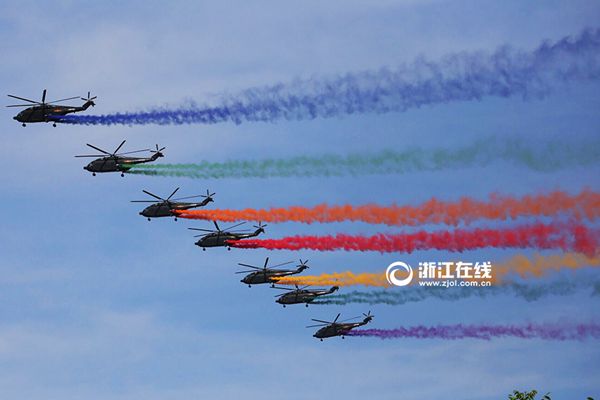 10点40分,26架直升机和7架教练机组成的空中护旗方队低空掠过,七道彩烟,仿佛象征中国人民走过硝烟奔向未来……在紧跟其后的抗战老同志方阵里,10名浙江老人热泪盈眶;在威武霸气的“雁门关伏击战英雄连”英模部队中,驻杭部队的200多名官兵军姿昂扬;方阵上空,杭州姑娘盛懿绯和嘉兴男儿韩国龙驾驶的战斗机划出一道又一道优美的弧线……