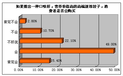 当北京精准企划市场调研部的访问员问及消费者,如果推出一种较现在的普通速冻饺子口味更好,营养价值更高的高端速冻饺子,您是否会购买时,回答会购买的消费者比率最高,占49.0%;回答肯定会购买的消费者比率占15.4%;两项合计达到64.4%。回答不好说是否会购买高端速冻饺子的消费比率占22.1%;分别只有10.7%和2.8%的消费者表示不会和肯定不会购买这种高端速冻饺子。从该项调研分析数据可以看出,高端速冻饺子能够得到多数消费者的认可,高端速冻饺子代表消费者潜在的需求方向。