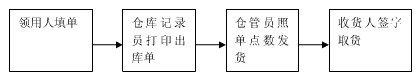3、入库规定 A、原材料购置入公司后,采购部送检员根据验收合格的材料开具送检单,送检单留一联给仓库记录员。送检员应及时登入管易通购销管理系统采购管理模块输入采购单,采购单上必须严格按照采购合同单价填入,当日送检单必须在本日工作日内完成及审核。 B、材料验收合格后,仓管员按送检合格的送检单验收入库。物资验收时要把实物与物资请购单上开具的名称、规格、数量、单价等事项相互对照,货物发生短缺、破损等情形时,材料采购部门做出相应处理意见。 C、仓库记录员根据检验合格的送检单,应在次日工作内之前打印《材料入库验收单》(一式三联),经质检员、仓管员、采购部负责人在《材料入库验收单》上签字,仓管记录员留存第一联(白联);采购部留存二联,红联采购部附在发票后报帐用,绿联采购部留存备查。 D、自制件通用件完工同原材料入库流程办理入库手续。 E、自制件非标准件采用当日入库即当日出库的原则。 F、财务部材料会计根据采购部提供的《材料入库验收单》、采购合同和增值税专用发票上的数量、单价、金额一致时,方可进行材料入库核算账务处理。 二、出库 1、出库定义 公司现在出库项目有:一次性领用材料出库、零星领用材料出库、项目合同领用材料出库、工程公司借用材料和工程公司领用原材料出库。 A、一次性领用材料出库是指钢材、木方、气体等不直接入库到仓库的物资,采用当日入库即当日出库的原则。 B、零星领用材料是指区分不了为哪项项目而零星领用的材料,各部门领用材料时须填写《材料领用出库单》。如以口头形式来领料,仓管员方可拒绝发货。 C、项目合同领用材料是指电气车间、包装组领用外购件、自制件种类数量繁多或进行整梯配货时,须提前将电梯配置清单交仓管员配货,按实际备货情况打印领用出库单。 D、工程公司借用材料出库,原则上不允许借用,如有特殊情况非借用不可须借用人在借用出库单上注明归还日期,仓库记录员应在归还日期之前有提醒借用人归还,但借用人未在规定的归还日期内归还似为销售材料出库。 E、工程公司领用原材料出库时,似同销售材料出库。仓库记录员应做好电子表格记录,每月月未编制工程公司领用材料出库明细表传递给财务部结算。 2、出库流程